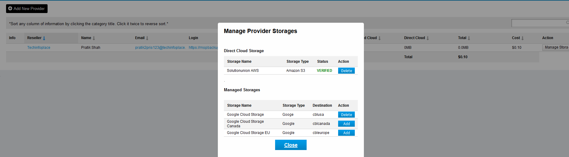 6. It will open a modal of the storage which you can manage to your provider. You can see that it will allows you to Delete the storage.